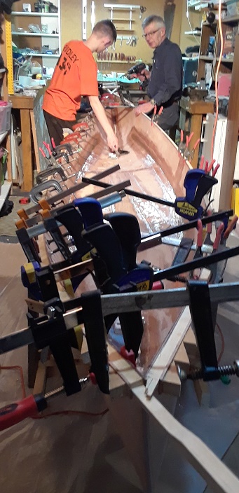 Although both gunwales are on, only one is glued at a time, not enough clamps or time, other ones just for balance.