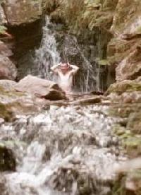 It's a gorgeous, sunny day and breakfast down at the Pond is a treat. We're in such a deep bowl that the sun doesn't get over it until we are about ready to move on. I'm in one of those moods where the body and brain seems to be greased. My aches and woes seem quite diminished and I am enjoying everything. The view climbing out of the bowl just seems to keep getting better. It's a perfect fall day for hiking. Lots of sun, but not too hot. We're in the shady woods a lot and following a nice running brook. During one of the water breaks, I stumble upon a sheltered little waterfall that absolutely MUST be swam in. IMAX gets a picture for me and and falls under its spell as well.