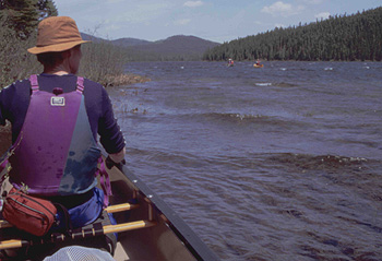 At this point the river is less than two canoe-lengths wide, and about one foot deep. The water is crystal-clear and running at about 4 km/hr at a constant incline. The river snakes back and forth between the hills and very soon enters Little Bonaventure Lake. After a short downwind paddle we again entered the river, always anticipating the log jams. The river continued to twist down the valley, with just enough water to cover the rounded boulders and gravel that make up the bottom. For the next hour we were swept along by the current and encountered nothing that required portaging or lining