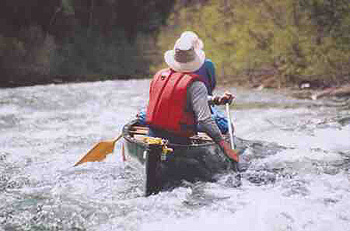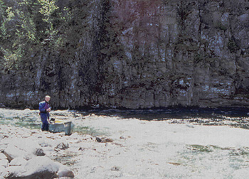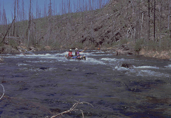 We all got up around 6:30 (everyone seems to be an early riser)to an early morning chill as the sun is not yet above the surrounding hills. We ate a leisurely breakfast and pushed off around 9:30, just as the sun made it over the eastern hills. The valley narrowed and the forest closed in as we passed the southern edge of the burn around km 99. From km 98 we encountered almost continuous Class 1-2 rapids, with some exciting ledges thrown in; however we were able to boat scout most of them, and all were runnable. At km 96 we pulled out to scout a series of ledges, just above the canyon. At higher water they might be runnable, but we decided to line the two ledges along the right bank, to the edge of Kickinghorse Canyon. There is a wonderful campsite on river right at the ledges. The ledges are tricky, but appeared doable in an empty canoe; however, we decided to press on since it was already midday.