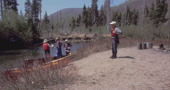 We arrived about 12:30 pm and quickly unloaded our boats. It was sunny and warm, and a strong wind was blowing down the lake. The water was becoming choppy as we started off on a one km paddle to the end of the lake. We reached the end of the lake and looked back. All around the lake, the hills were cloaked in a dark green mantle of mature spruce and fir. Ahead, the river flowed through a leafless forest of twisted, burnt trunks.