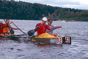 are in line with the finish and paddling hard. The canoe sinks down in suck water. Slightly