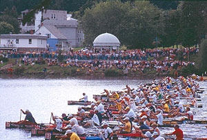 watching, marvelling, showing off, and eating. It is the day before paddlers march down to